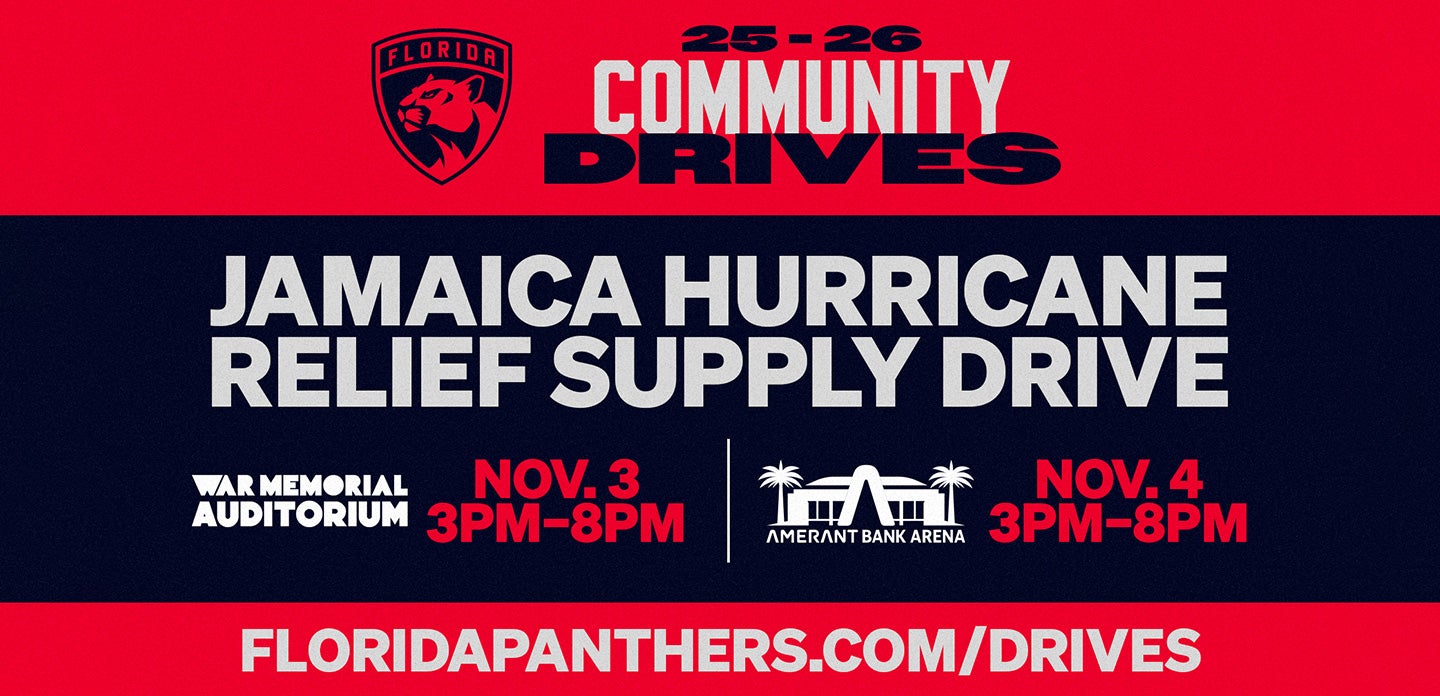 On Nov. 1, fans are encouraged to donate needed supplies including water, flashlights, lanterns, tarps, bug repellent, sanitary items and Starlink satellite internet terminals to the collection bins on the Publix Plaza prior to the Panthers vs. Dallas Stars game. All supplies will be sent to Jamaica to assist in relief efforts.