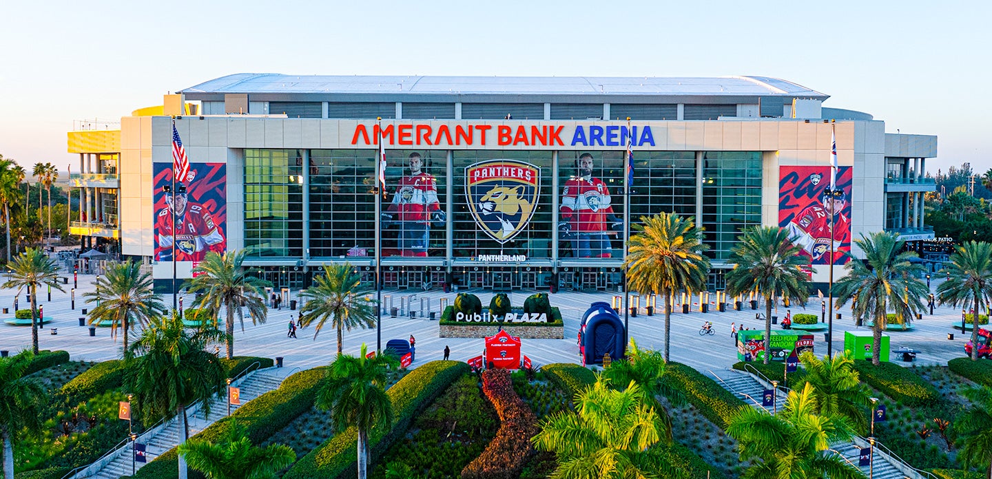 The Florida Panthers play their home games at Amerant Bank Arena in Sunrise, Florida. Sunrise is located west of Fort Lauderdale and north of Miami. Sunrise is conveniently located at the center of Miami-Dade, Broward and Palm Beach counties. It is also easily accessible via 595, I-75, I-95 and the Sawgrass Expressway.